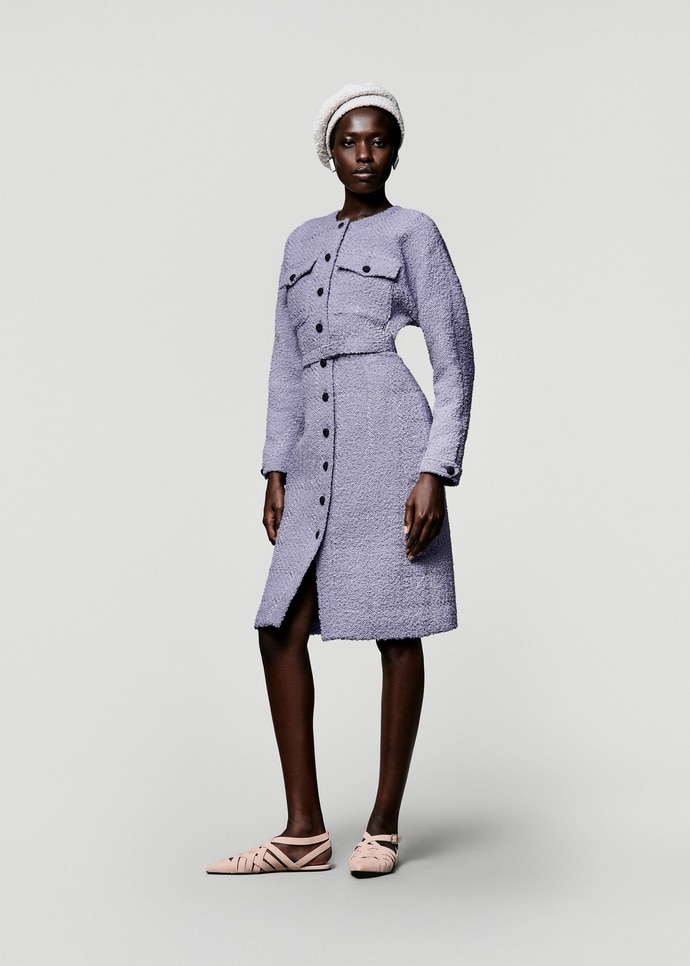 The Manon shirt dress is made from tactile bouclé blended with alpaca, wool, silk, and linen and worked with a tonal overcheck pattern. It is shaped with a round neckline and kimono-style sleeves, then cinched at the waist with a leather-lined tie belt for a feminine silhouette. Intricate edging along the neckline, front, and cuffs lends a polished finishing note.